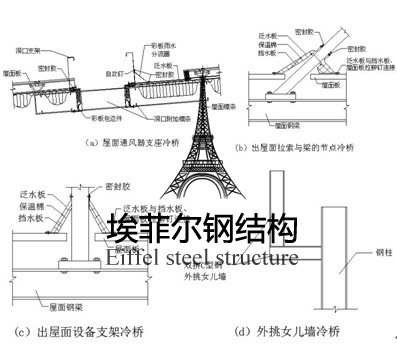 冷桥:也称热桥,这是南北方对同一事物现象的不同叫法。北方称为冷桥,而南方一般称为热桥(在冷库中也称冷桥)。本文后统称为冷桥。钢结构房屋的冷桥主要是指钢结构建筑外围护系统与外界进行热量传导时,由于围护结构中的某些部位传热系数明显大于其他部位,使得热量集中地从这些部位快速传递的现象。这种快速传递的现象,一方面会大量地发生热损失,严重的情况下相当于降低三分之一的玻璃纤维保温棉的热阻值(《钢结构》2004年第一期张伟《钢结构建筑的保温设计》),另一方面也可能造成冷凝结露现象。