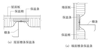 为解决由于保温棉被压缩而造成热损失的现象,可以在屋面板墙面板与檩条交接部位设置保温条(如图5)。