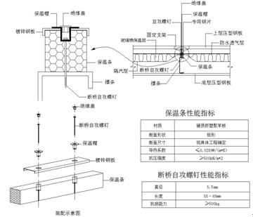 屋面檩条冷桥解决方案就是使用檩条保温条和钢结构断桥自攻螺钉。应用方法就是在铺设保温棉之后,在固定自攻钉或安装支架的部位,用断桥自攻螺钉先行安装防冷桥保温条和镀锌钢板(与檩条等厚度),将屋面板或支架固定在镀锌钢板上。自攻钉或支架的间距就是平时固定屋面板或支架的间距,具体方法(见图7)。
