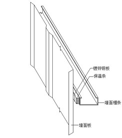 墙面檩条冷桥解决方案与屋面檩条冷桥解决方案是基本相同的,其不同的地方仅在于墙面檩条保温条要沿檩条全部设置(屋面檩条保温条只是在有自攻螺钉的部分设置,大约250-300mm)。这主要是墙面必需与保温条全部连接,否则在风荷载的作用下,墙面板会搧动)。具体方法(如下图8)。